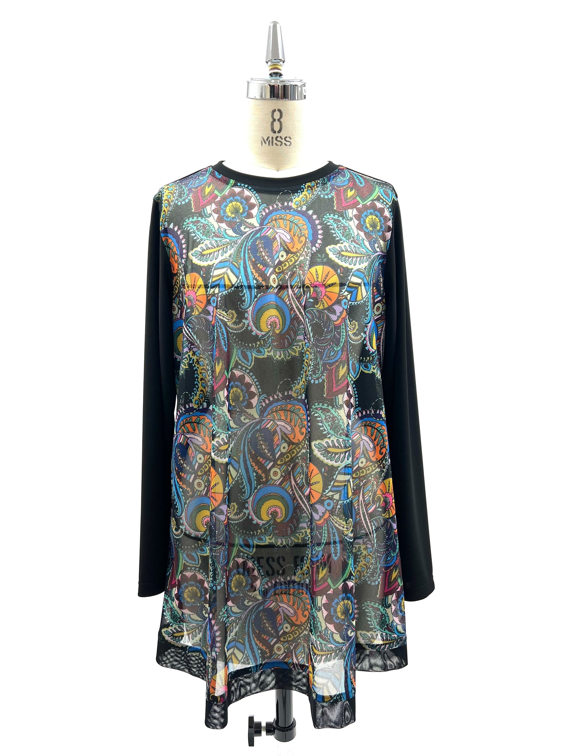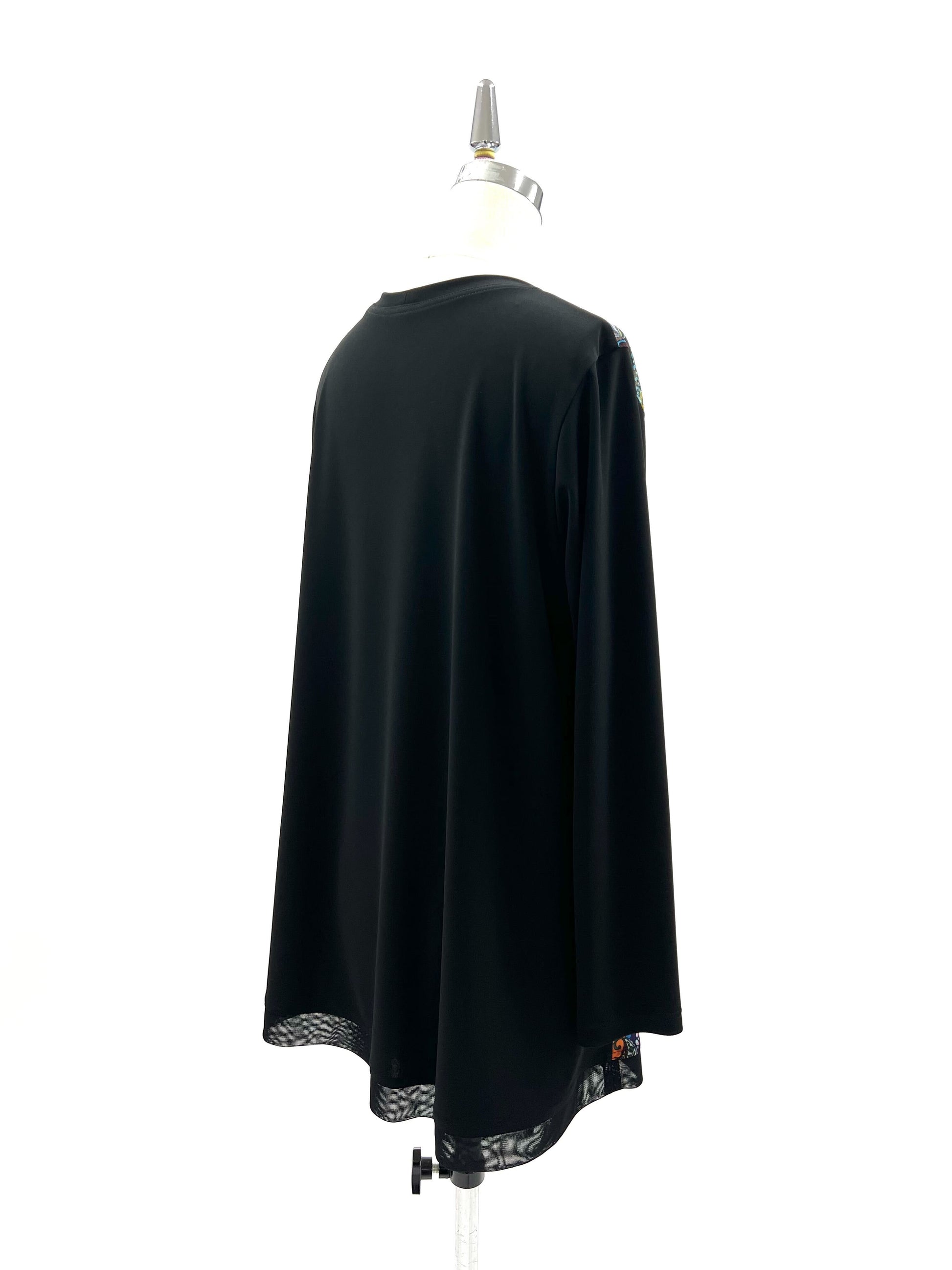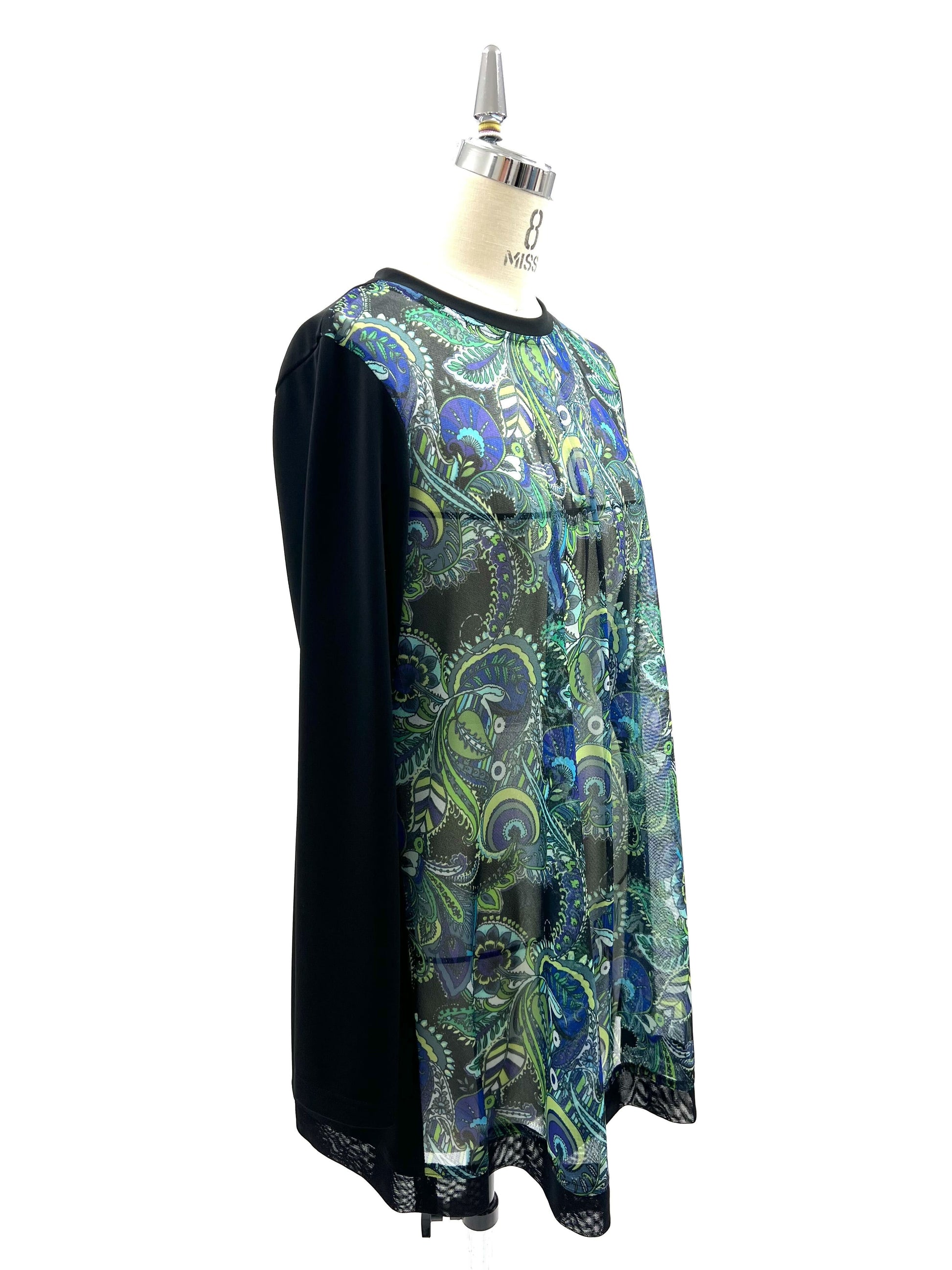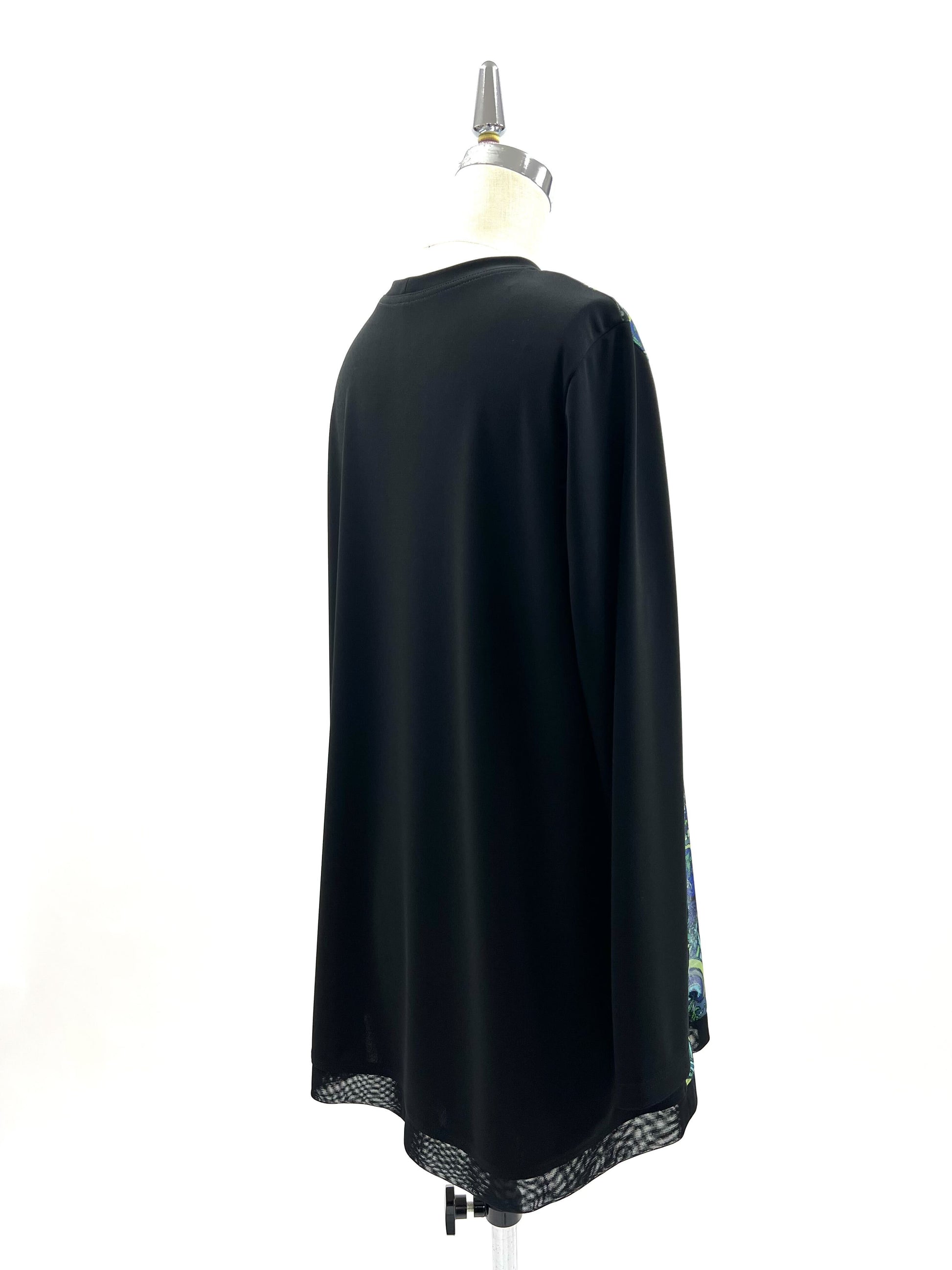 定番のポリエステルメッシュに独特な花とペイズリー柄で組み合わせたプリントメッシュを前身にあしらい、後身・袖はポリウレタンを配合した伸びのある着心地が良いスムースを採用し裾にはアクセントに無地のメッシュで切り替えてスッキリした印象にまとめてある丸首Tシャツです