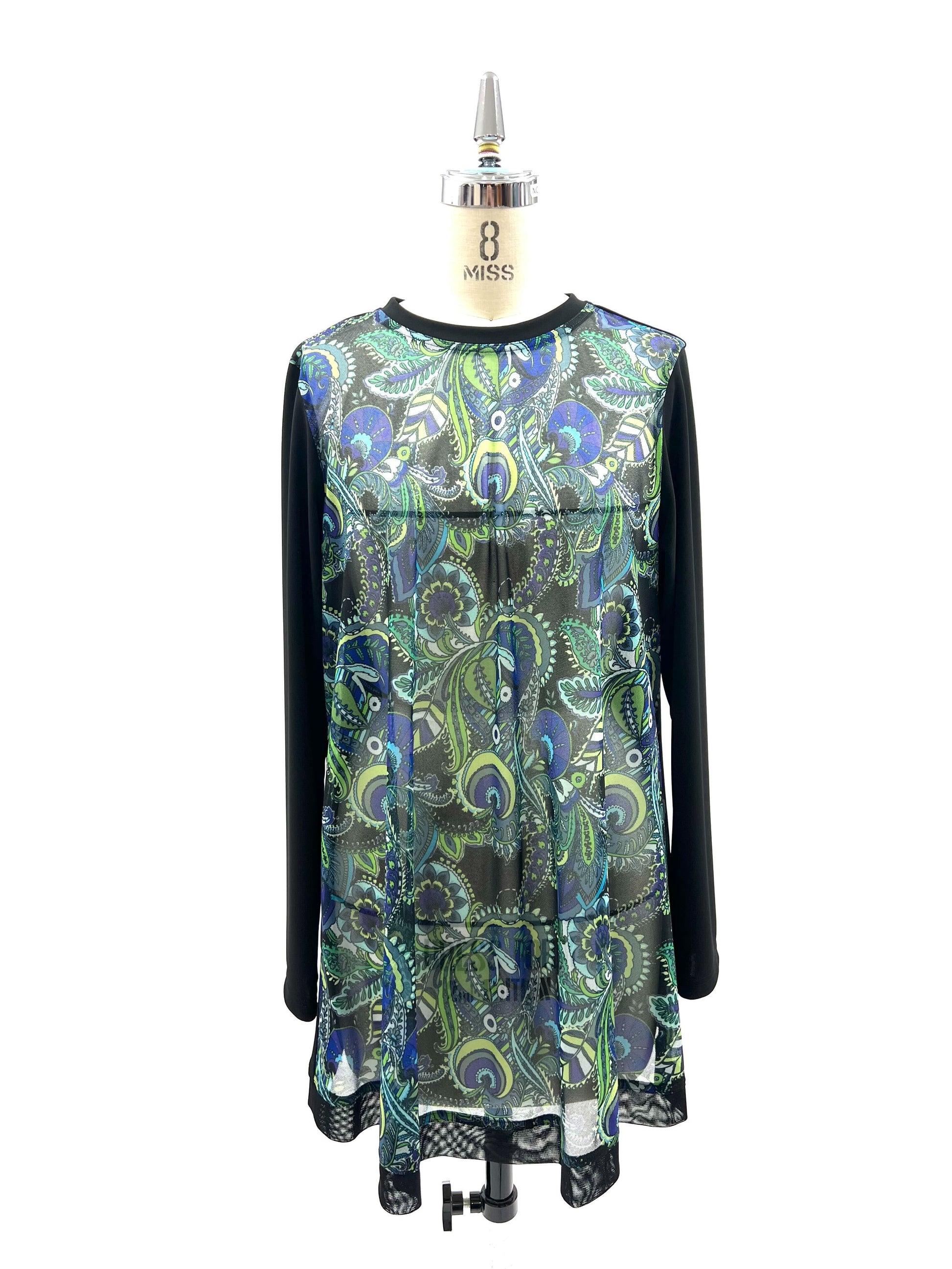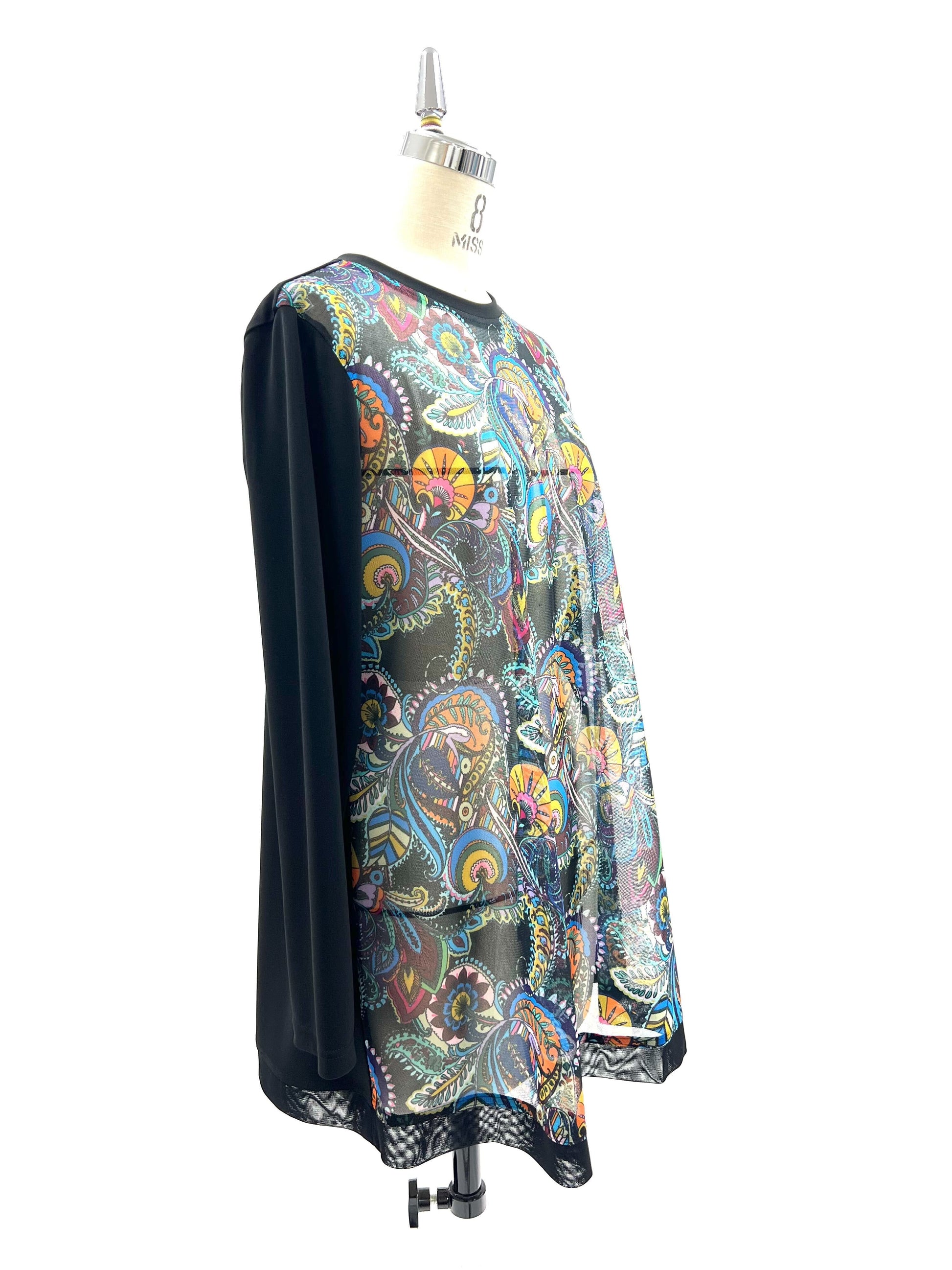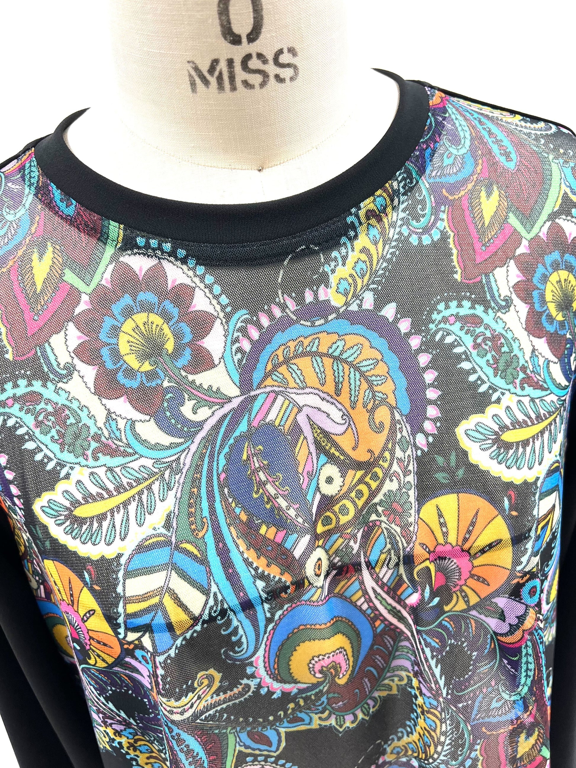 定番のポリエステルメッシュに独特な花とペイズリー柄で組み合わせたプリントメッシュを前身にあしらい、後身・袖はポリウレタンを配合した伸びのある着心地が良いスムースを採用し裾にはアクセントに無地のメッシュで切り替えてスッキリした印象にまとめてある丸首Tシャツです