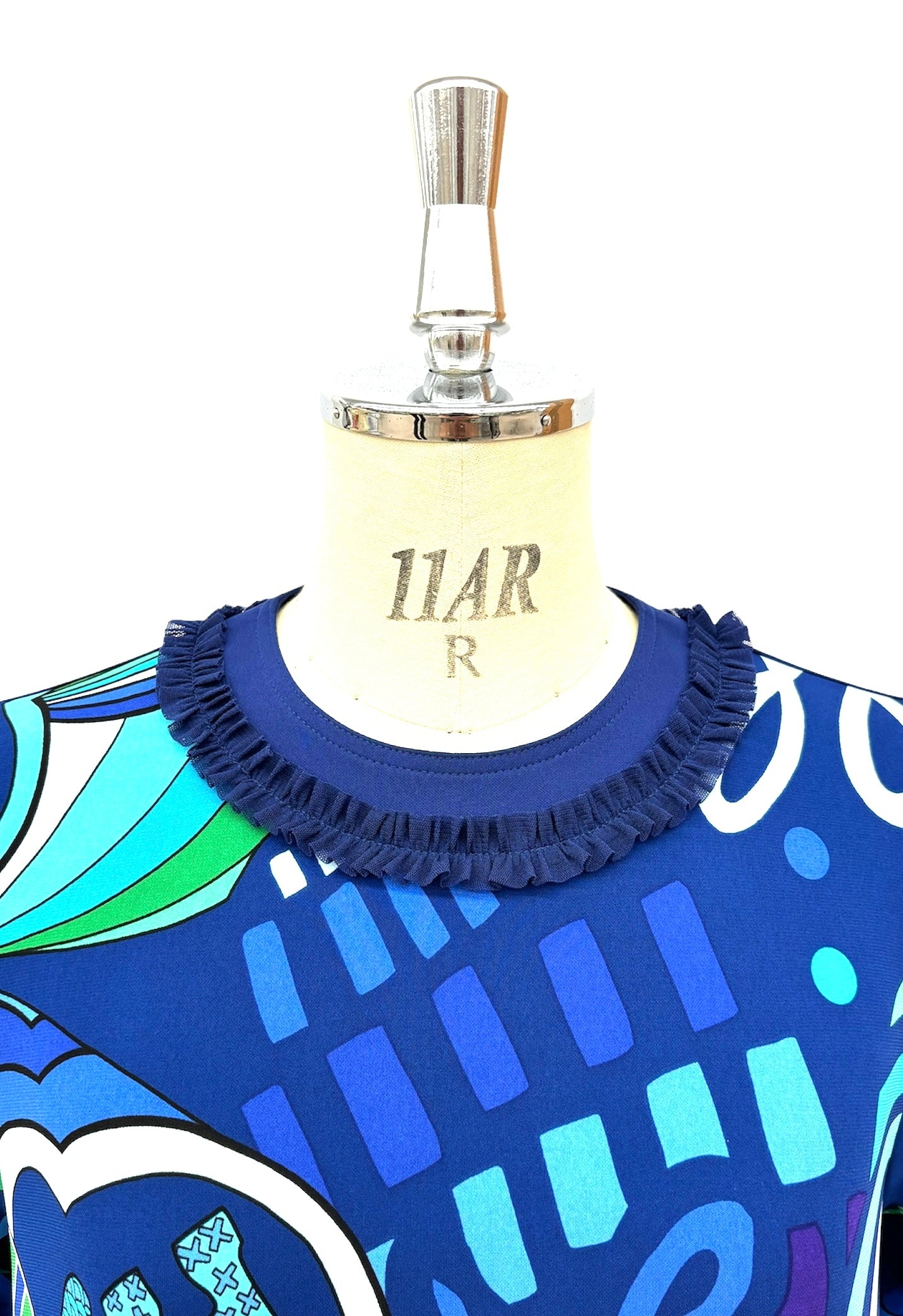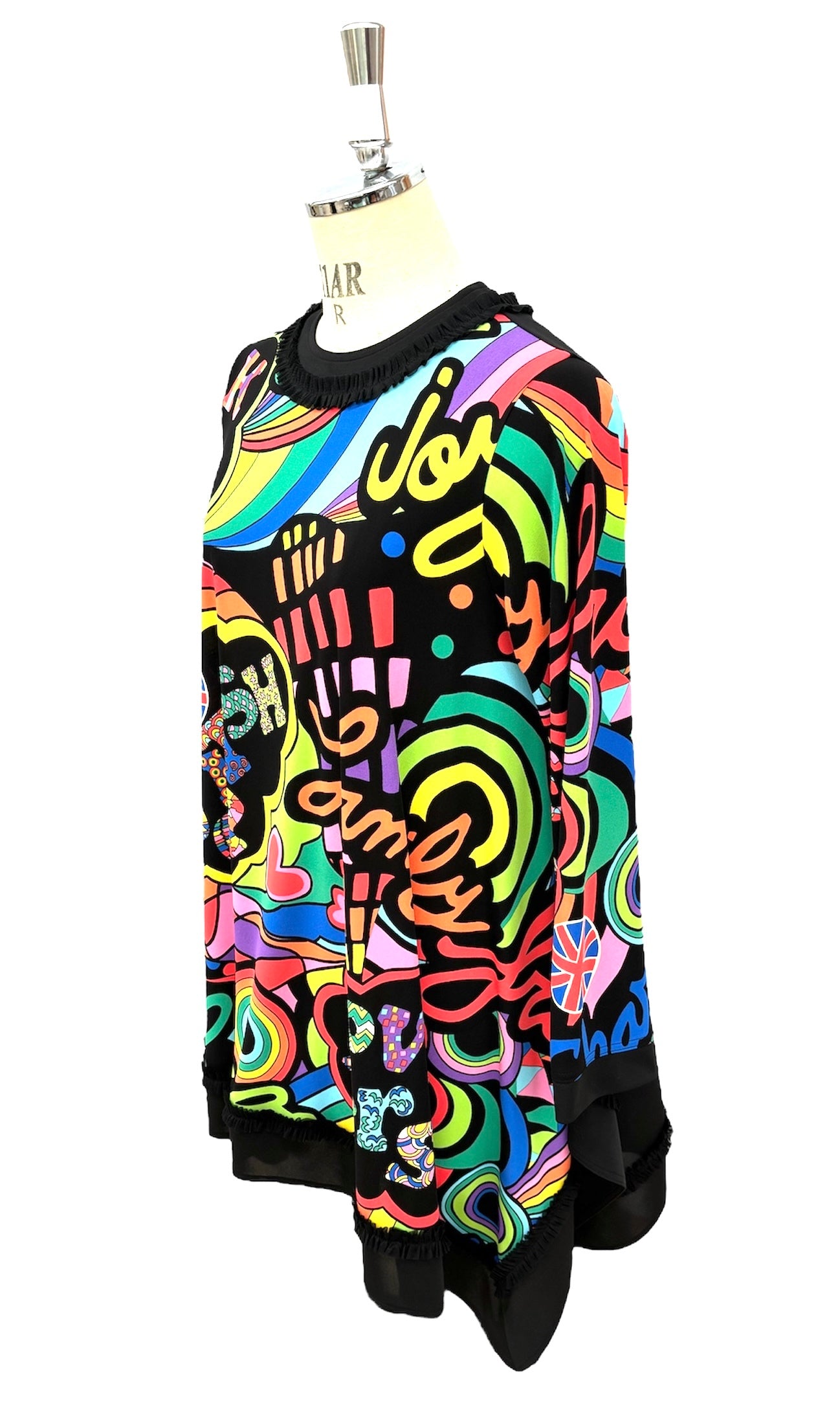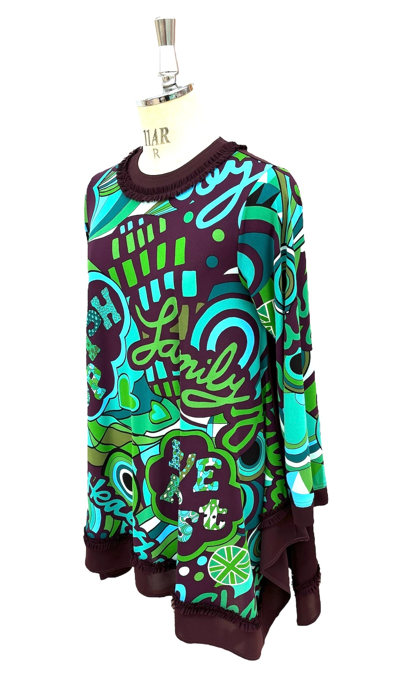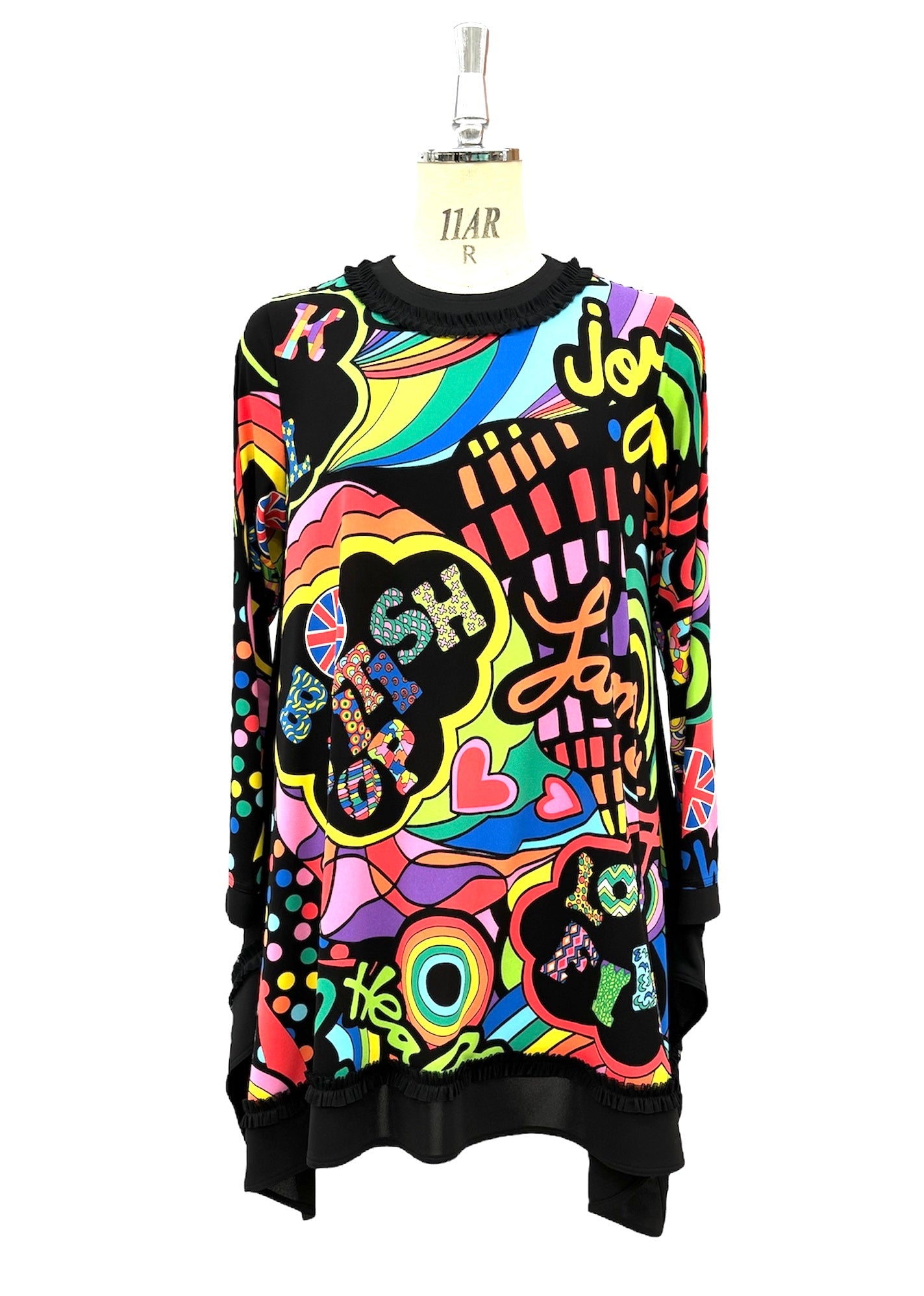 今回イメージのLONDONをPOPなイメージに仕上げたプリントを涼やかなトリアセテートの生地にのせた後短冊明きのAラインSH。衿と裾にミニフリルを付けて女性らしさもありながらPOPで明るく優雅な印象に仕上げられてます。※柄位置は写真と異なる場合もあります