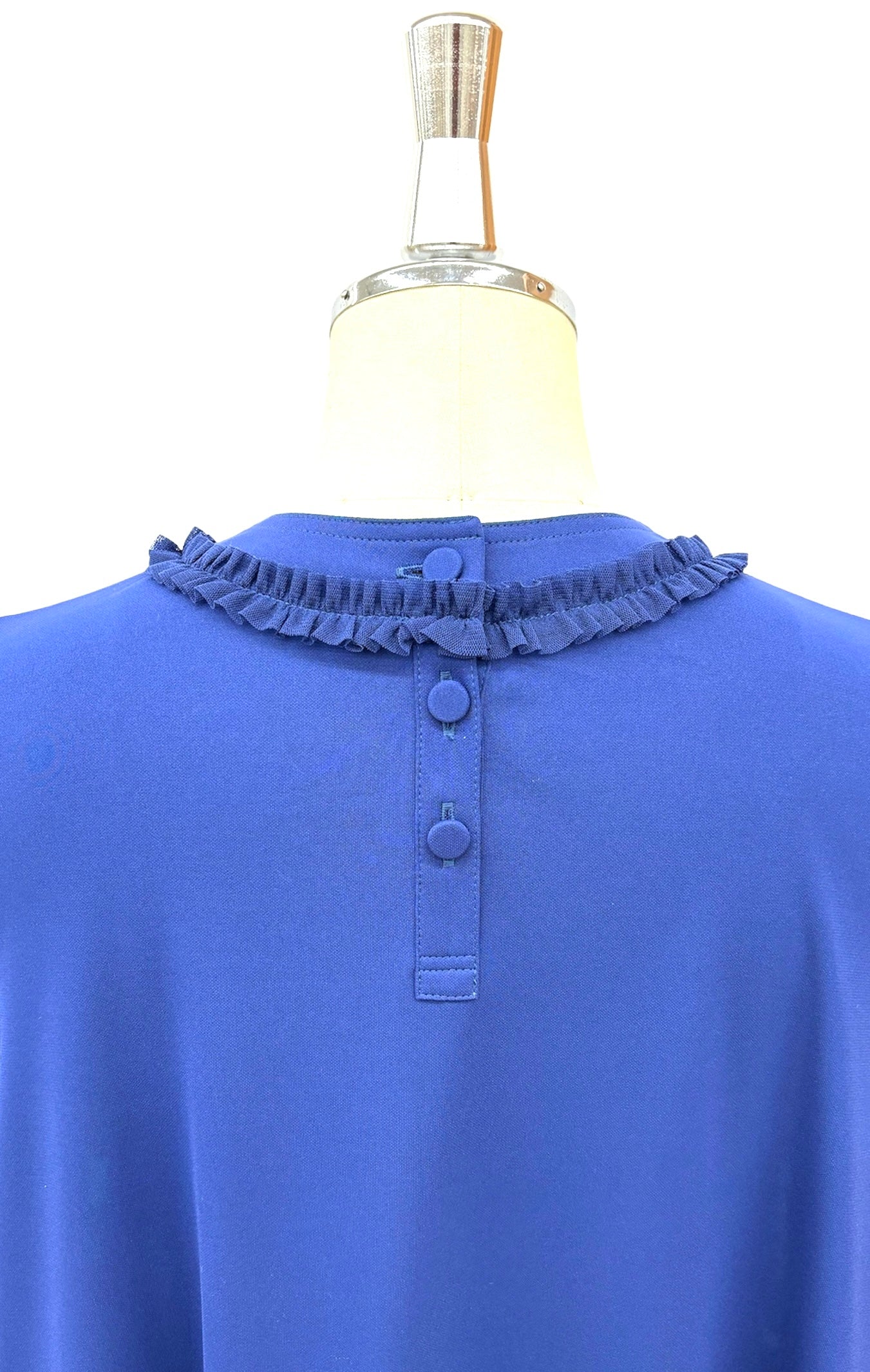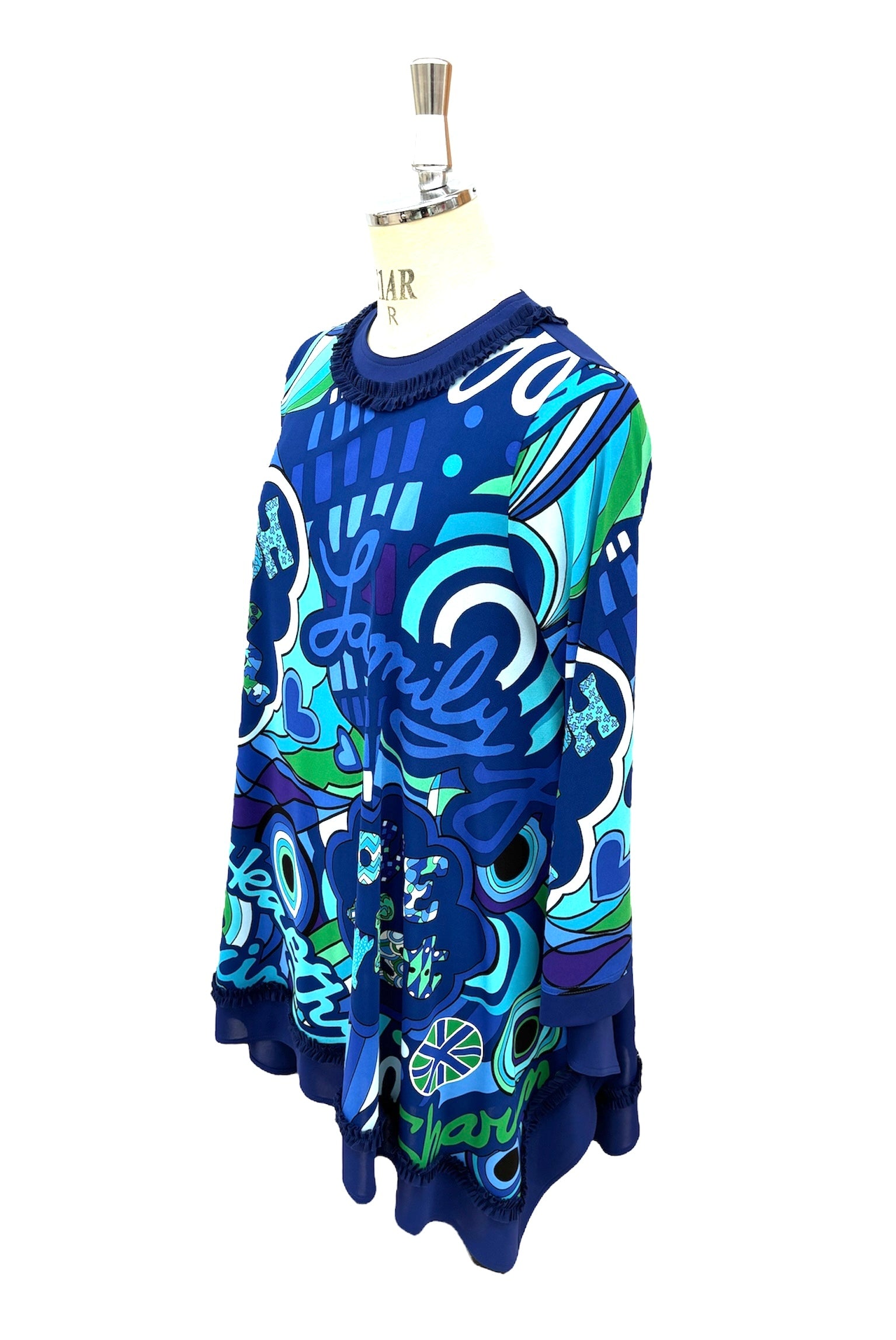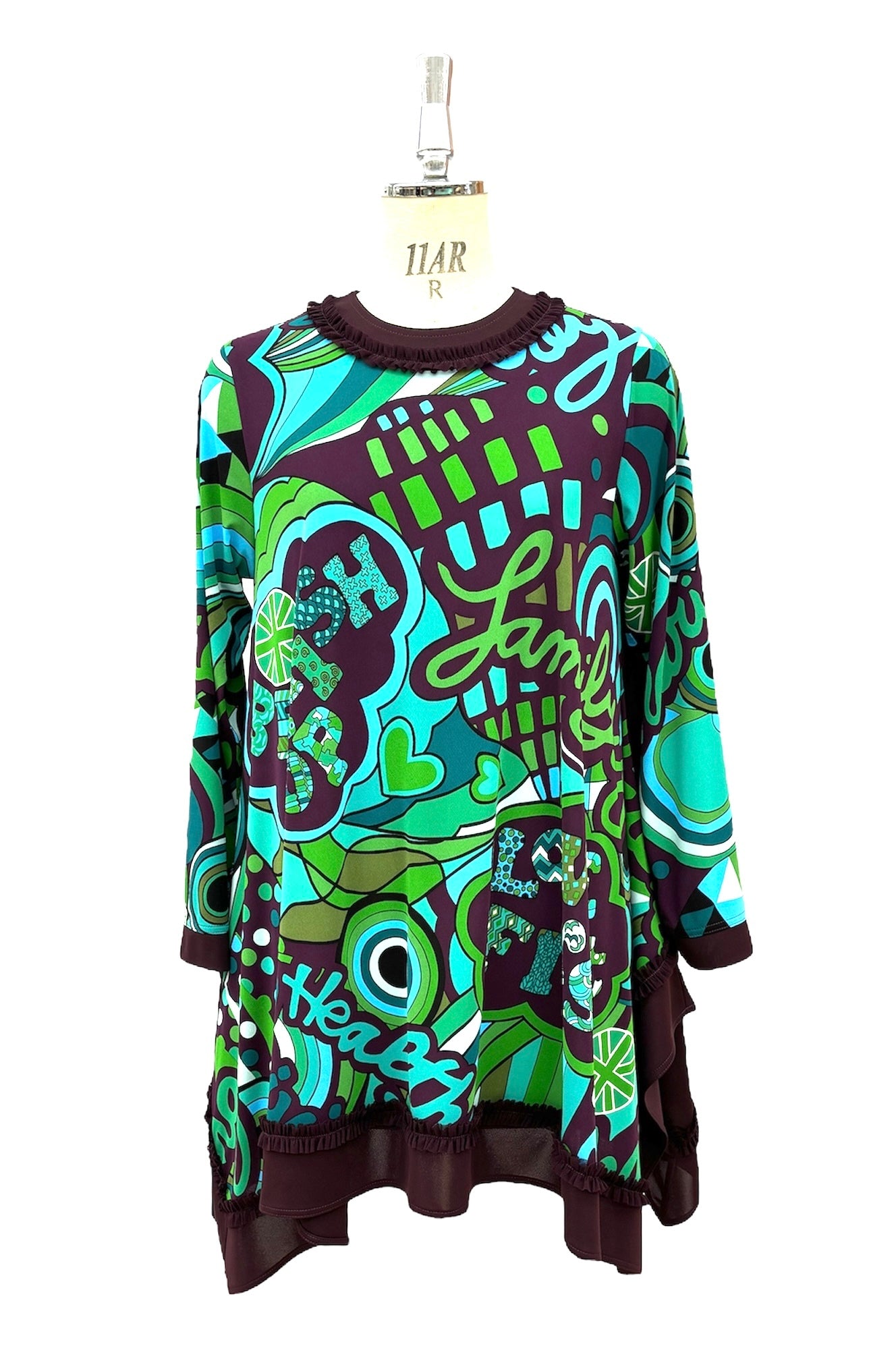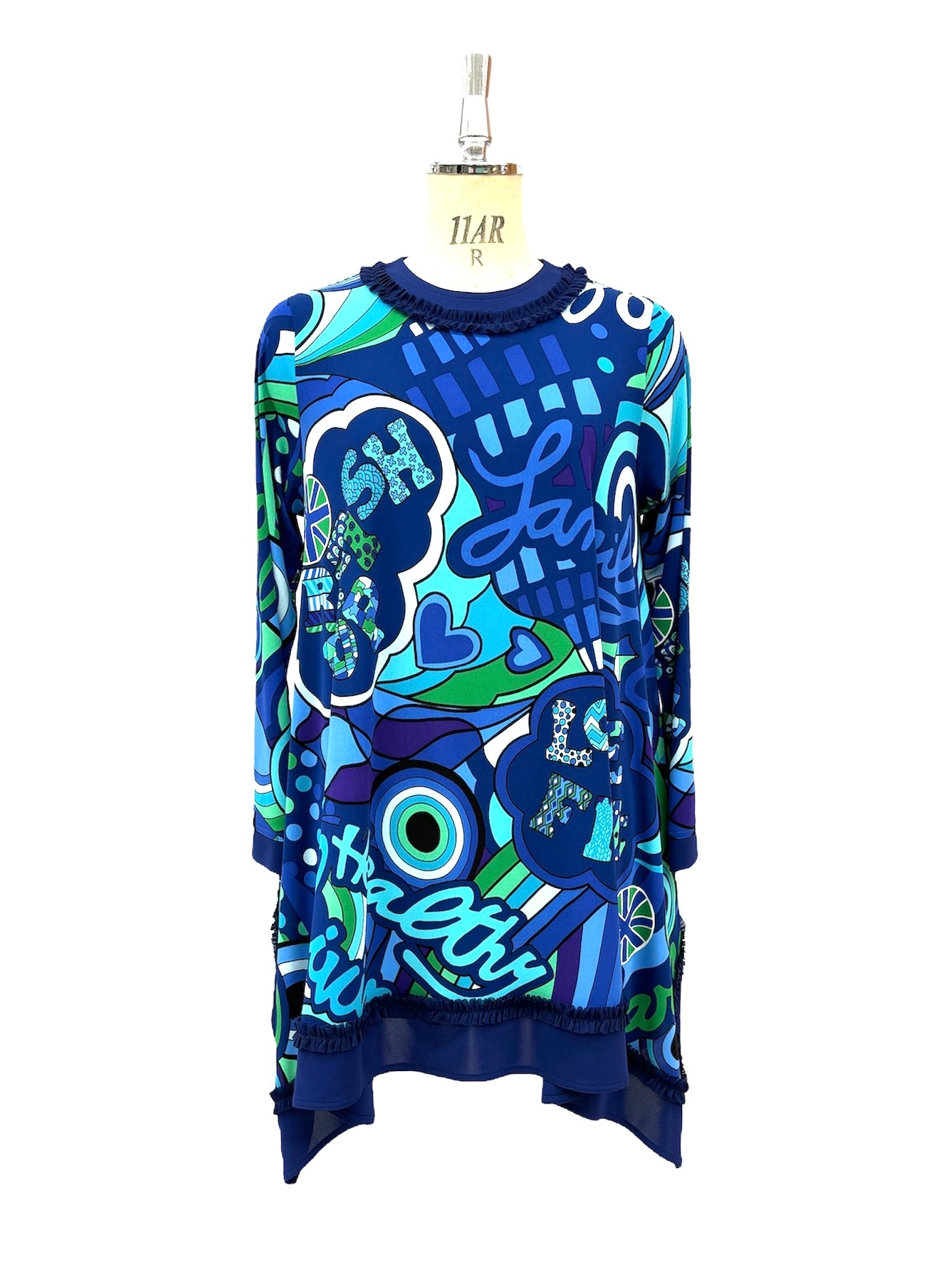 今回イメージのLONDONをPOPなイメージに仕上げたプリントを涼やかなトリアセテートの生地にのせた後短冊明きのAラインSH。衿と裾にミニフリルを付けて女性らしさもありながらPOPで明るく優雅な印象に仕上げられてます。※柄位置は写真と異なる場合もあります