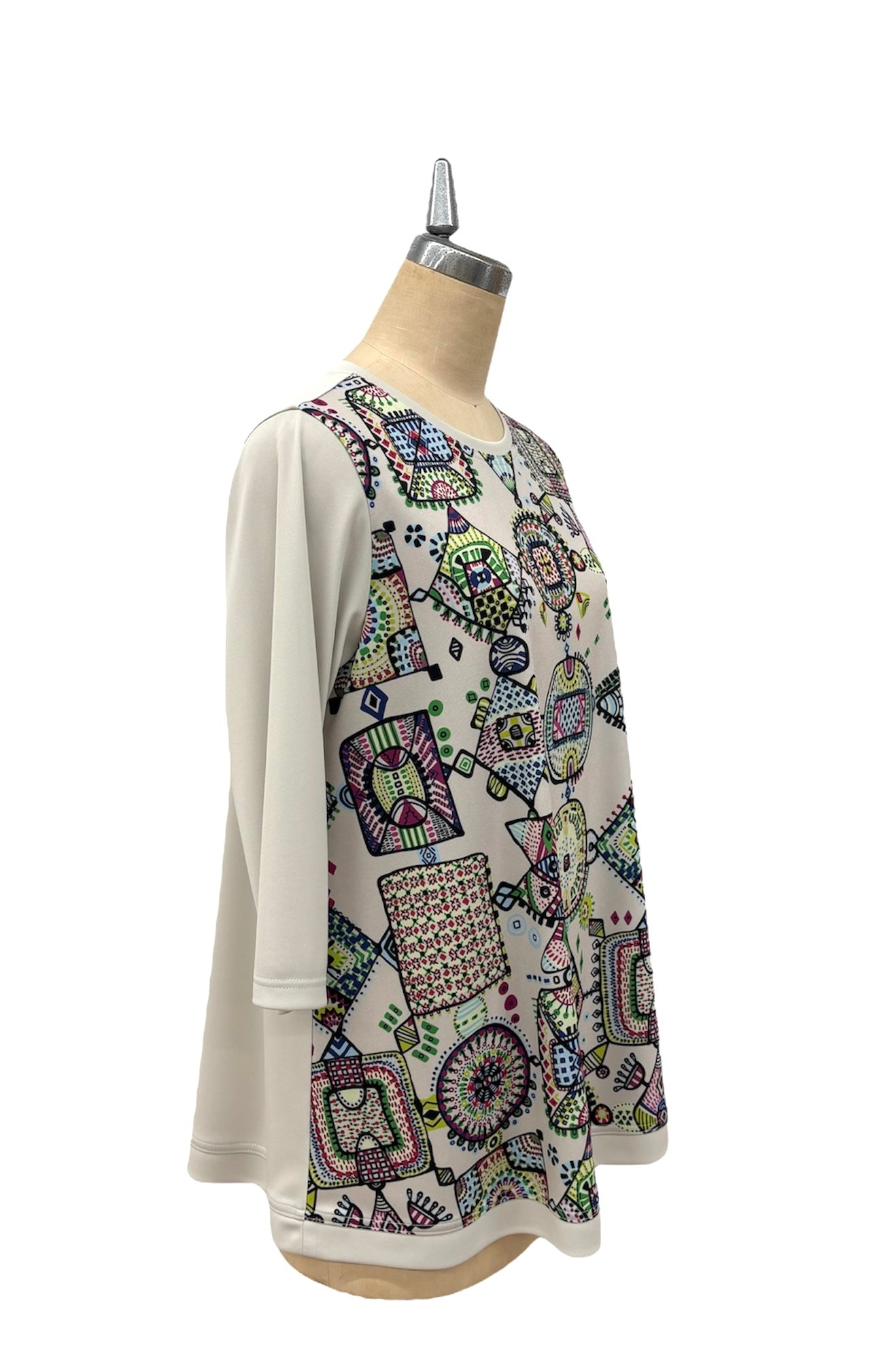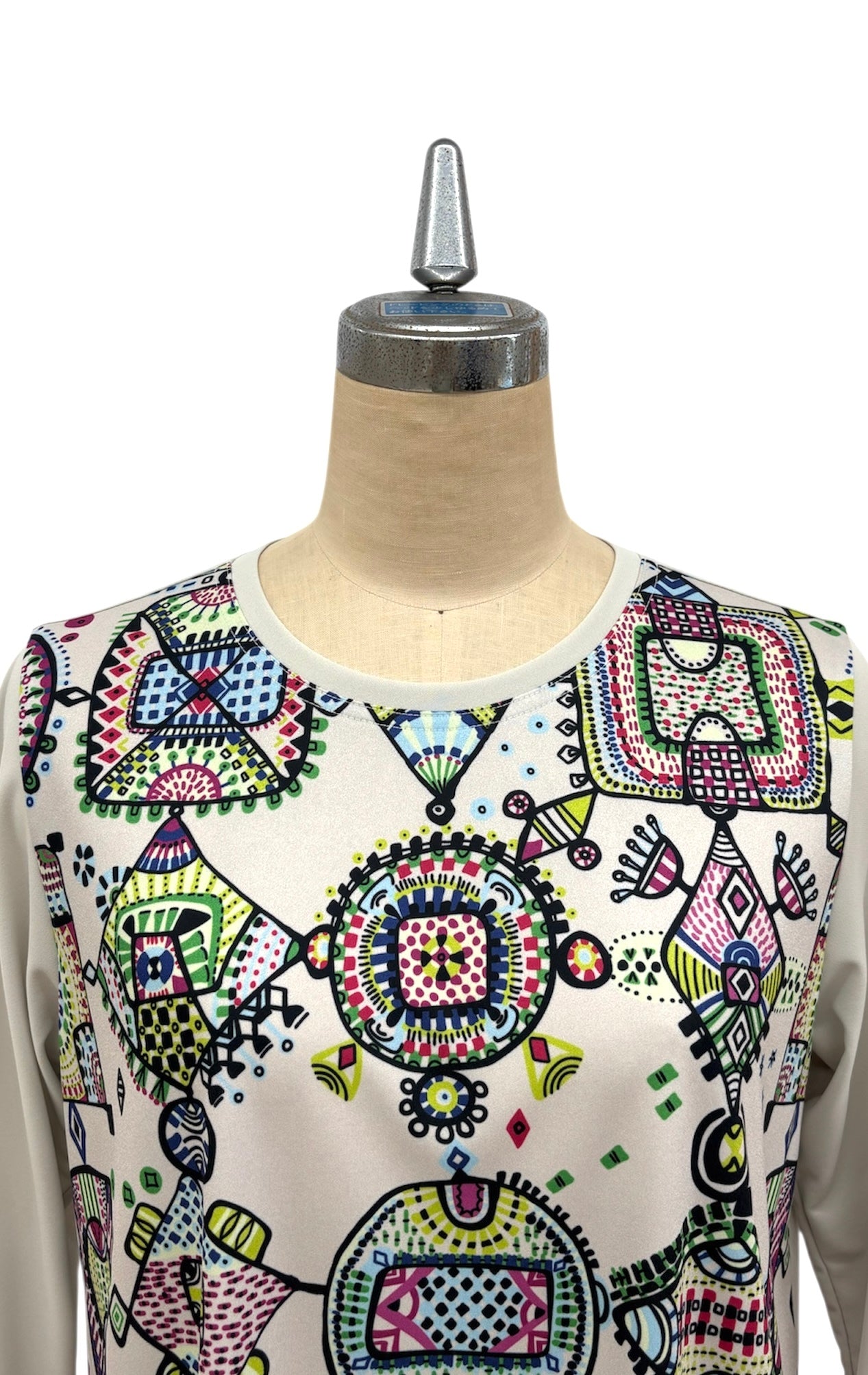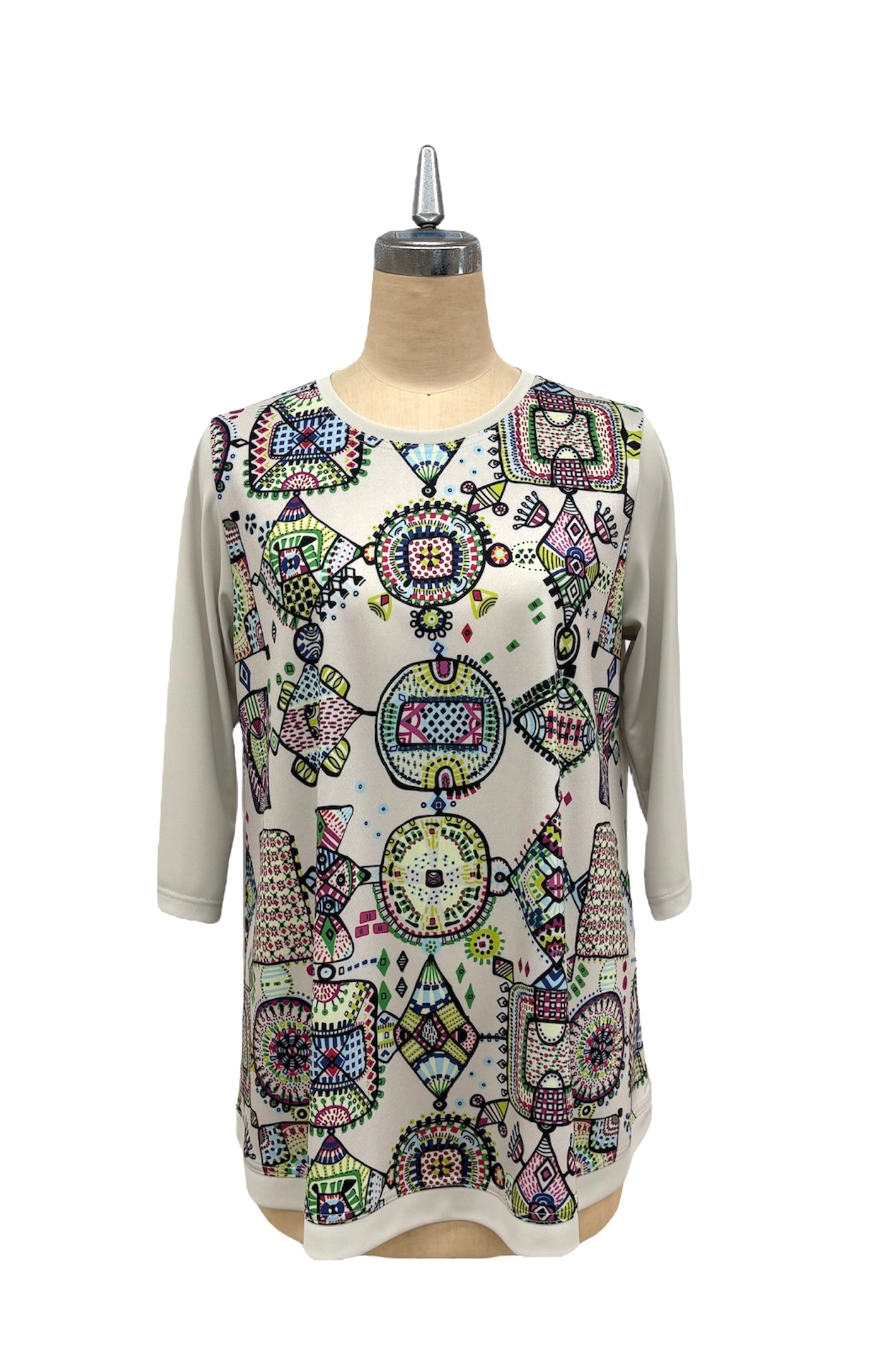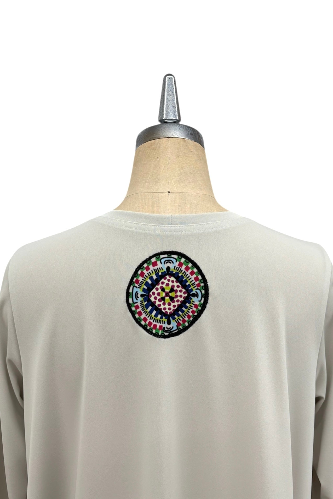 サラッとした滑りの良いスムース生地に幾何学模様をプリントしたシンプルなAラインTsh 後身頃に幾何学模様をワンポイントとしてアップリケでアクセントを付けてTOKUKOらしく仕上げてあります