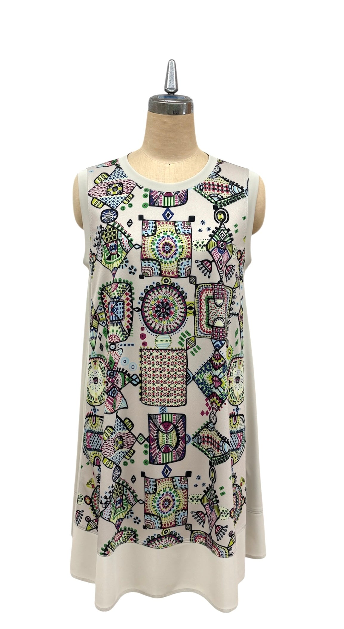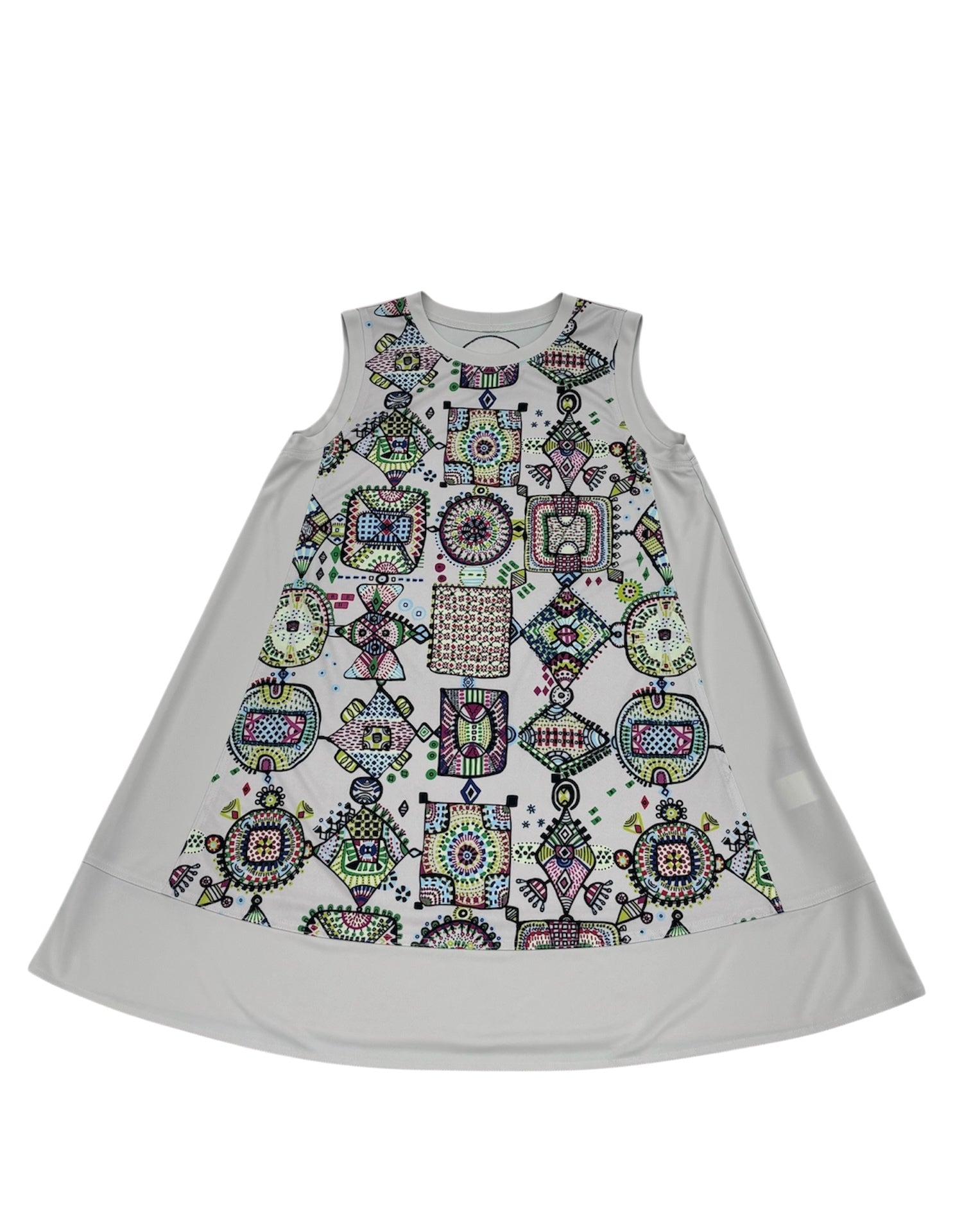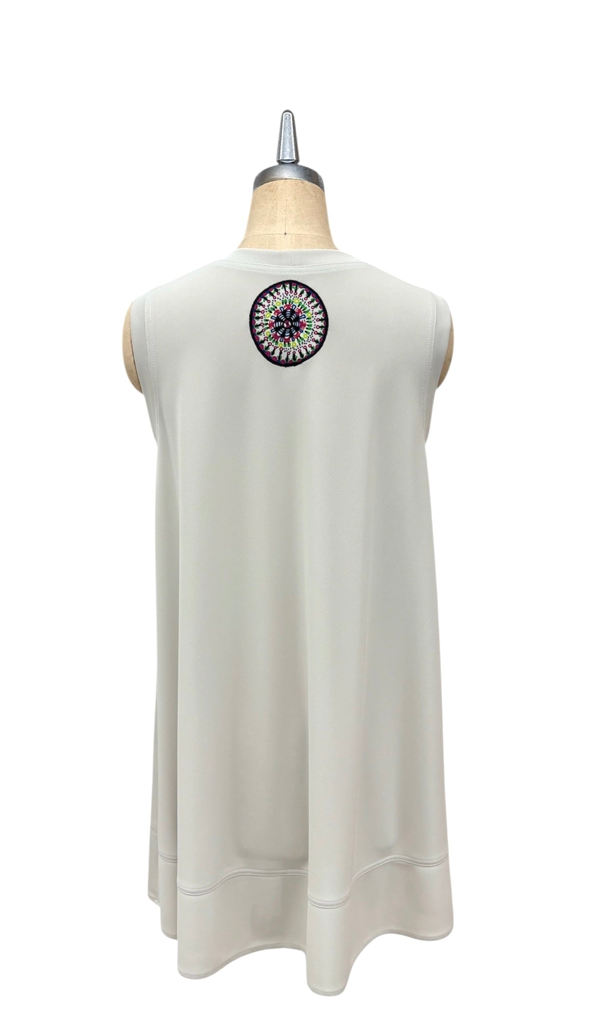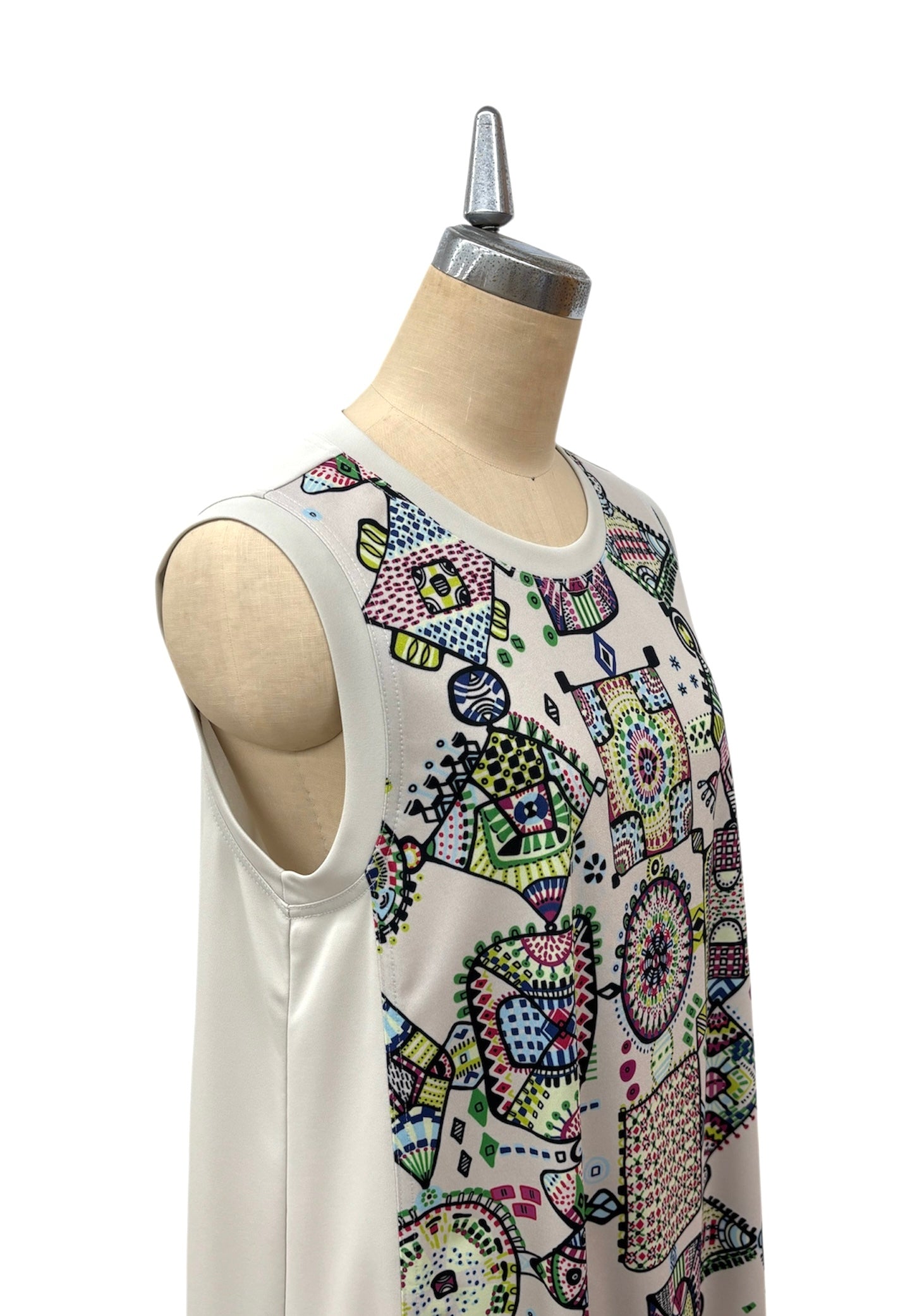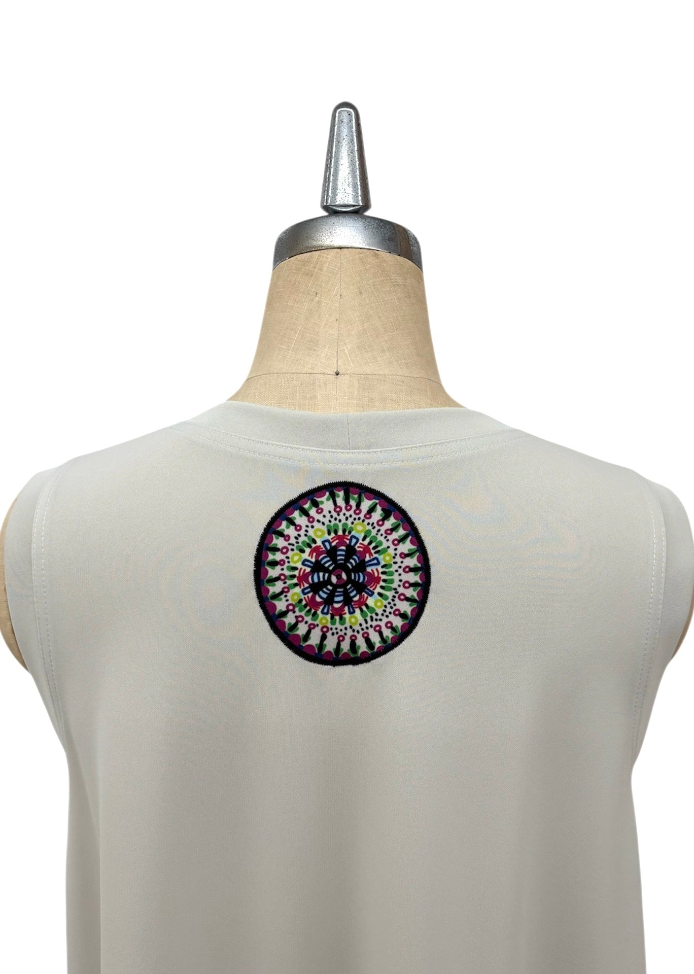 サラッとした滑りの良いスムース生地に幾何学模様をプリントしたシンプルなAラインロング丈ジレ 後身頃に幾何学模様をワンポイントとしてアップリケでアクセントを付けてTOKUKOらしく仕上がてあります
