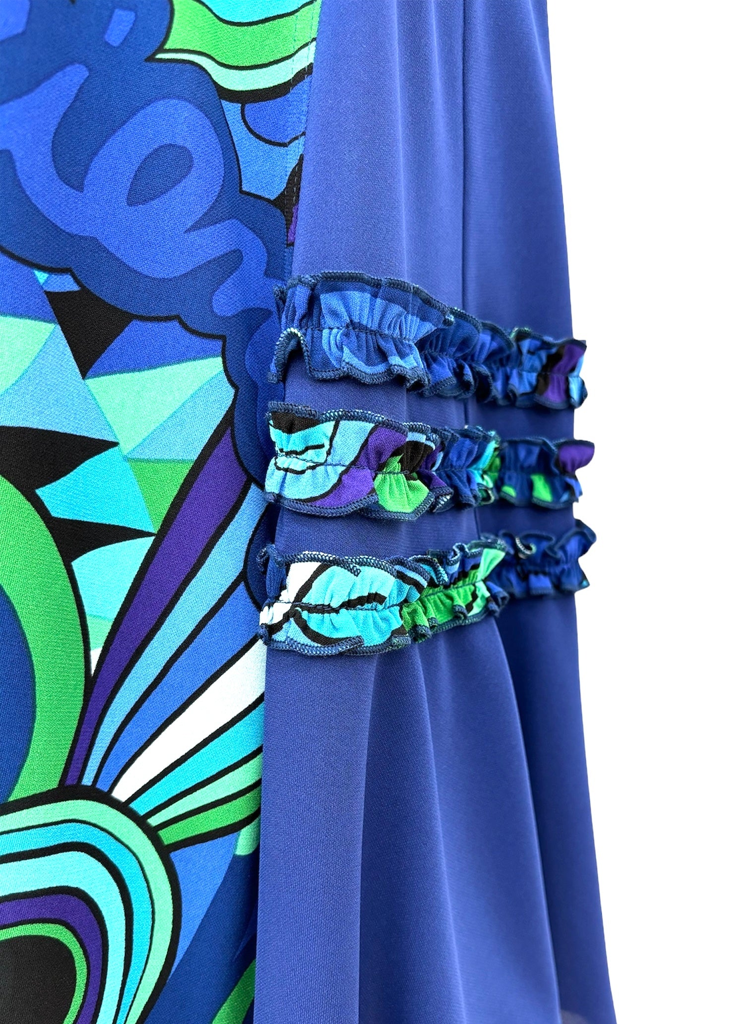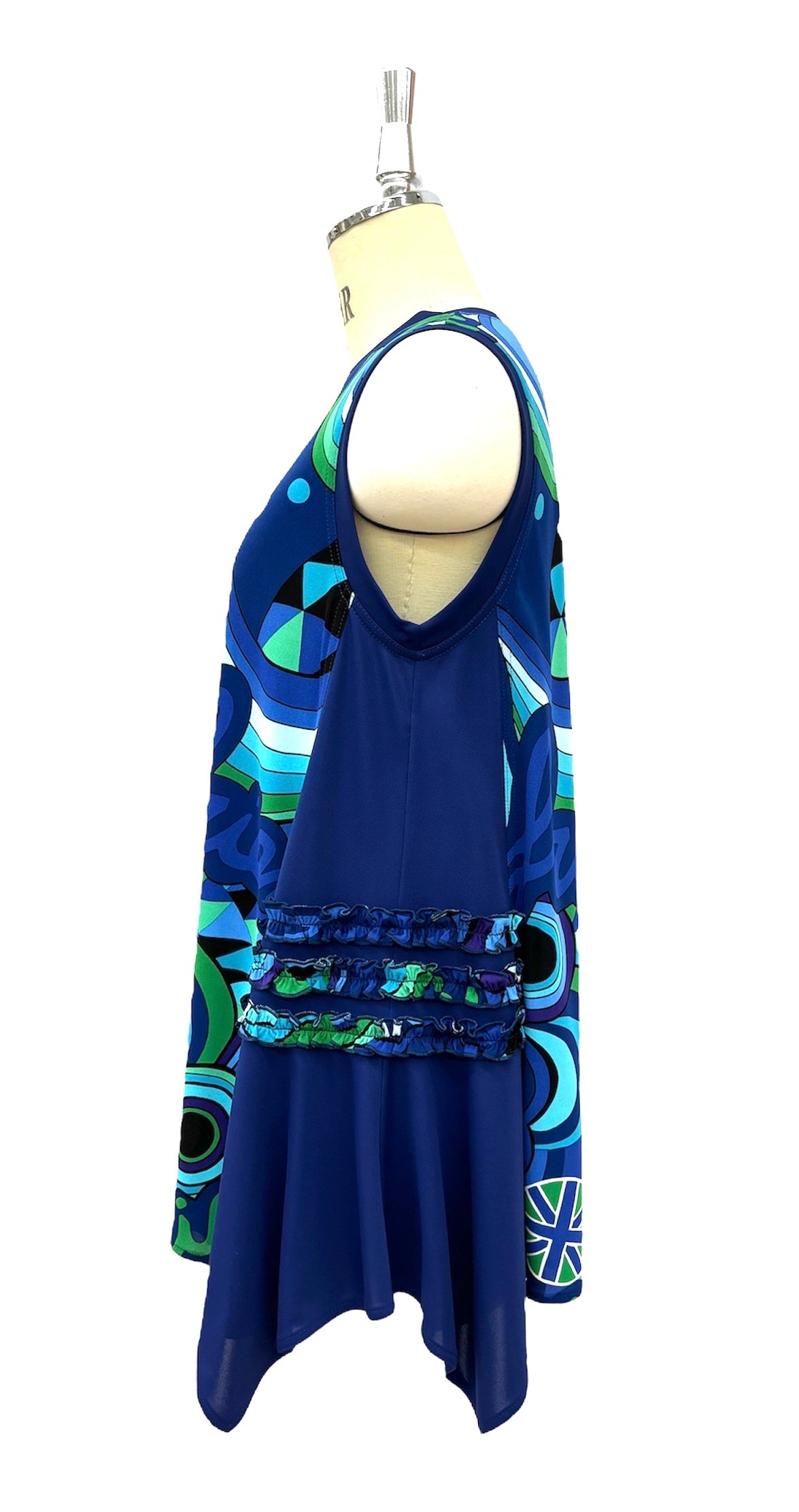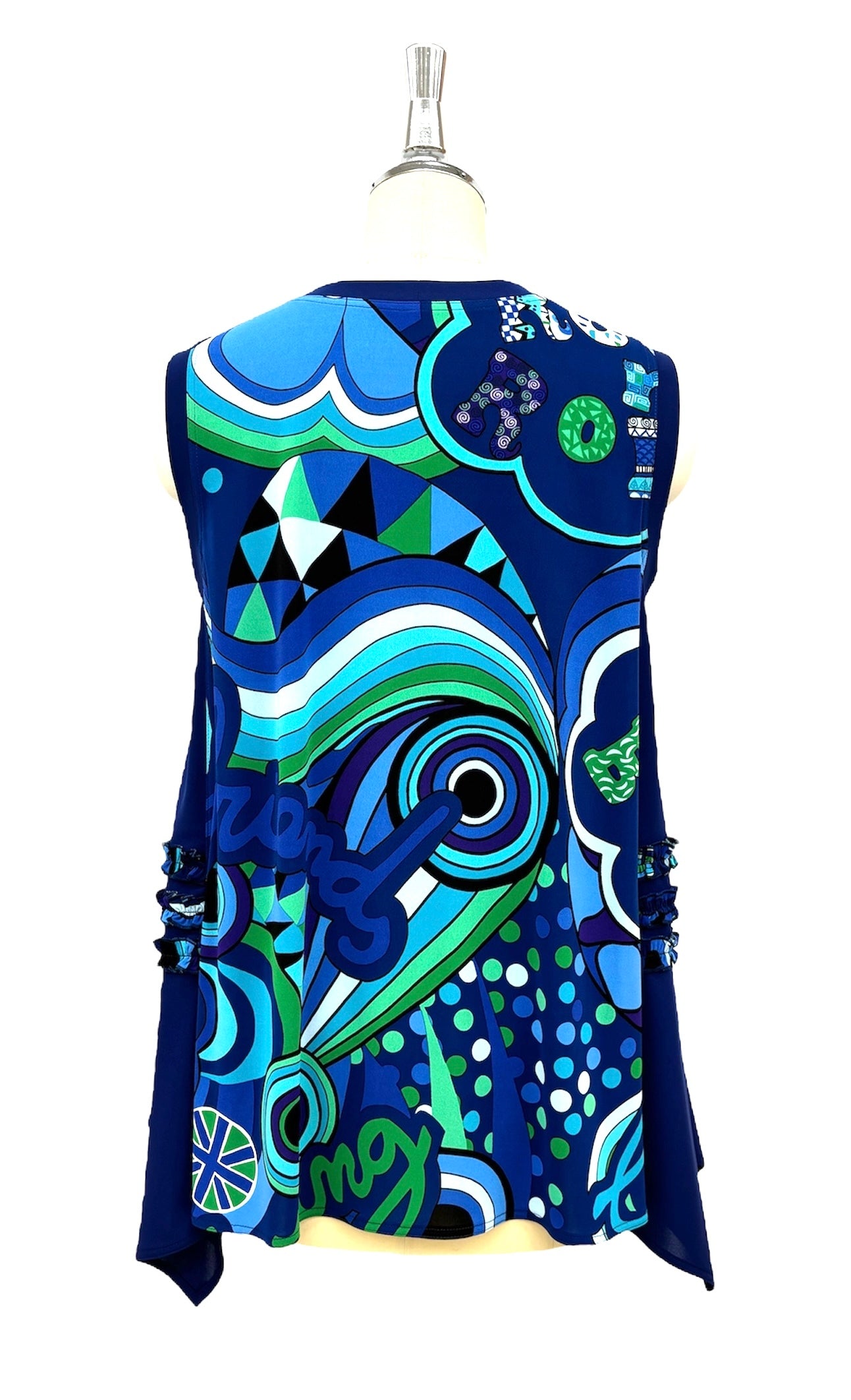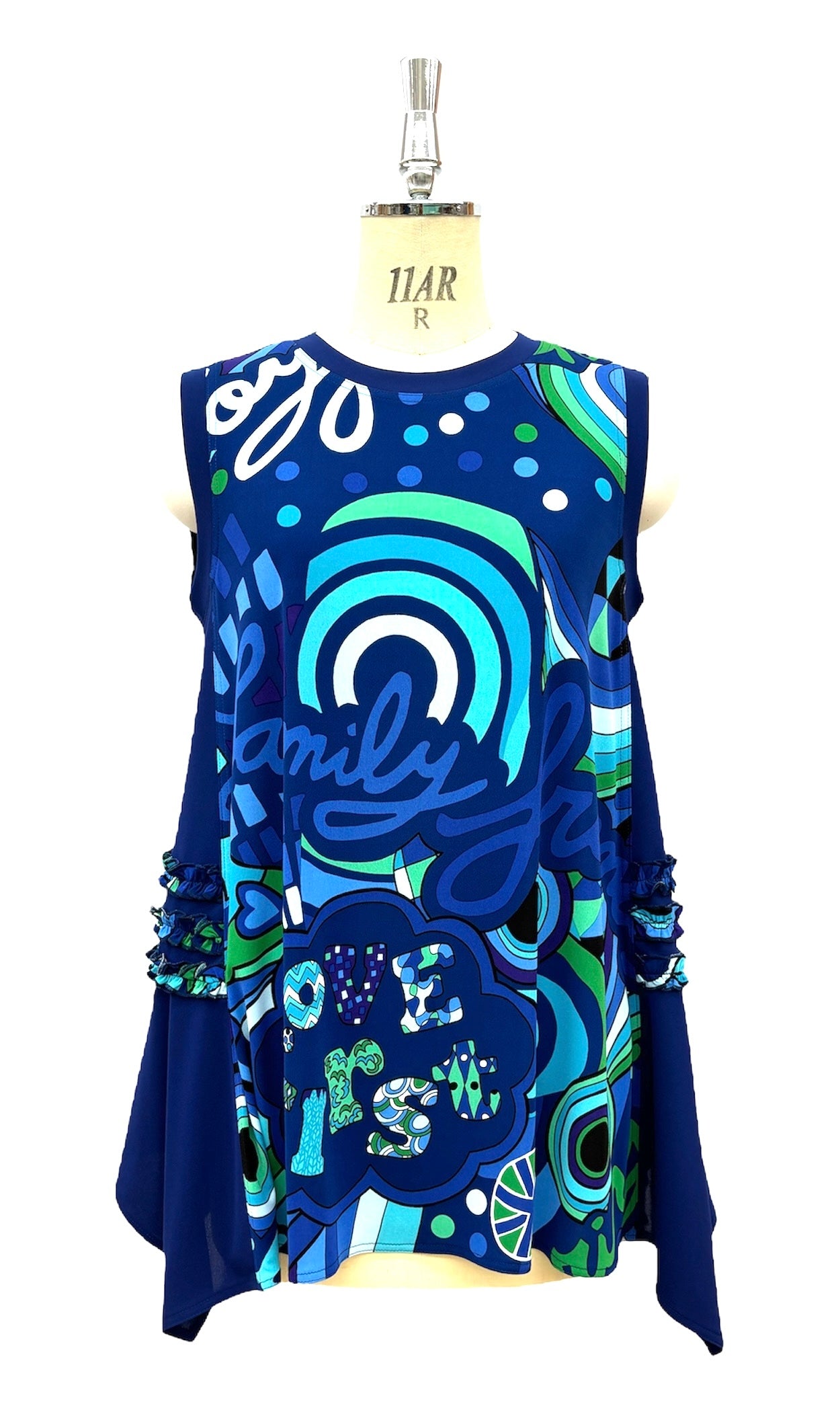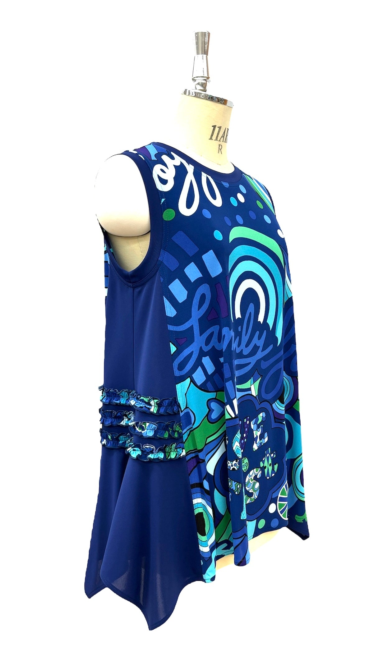 TOKUKOオリジナルのポップアート柄をシンプルな丈が長めのジレに仕上げました。飽きのこないプレーンな形ですがアクセントに脇無地部分に柄でフリルをつけて可愛く仕立ててあります。