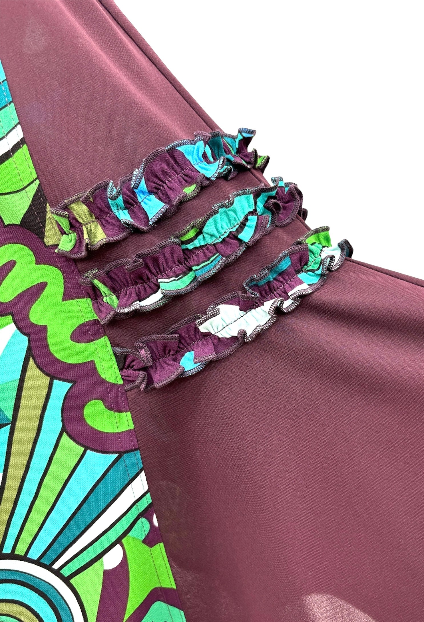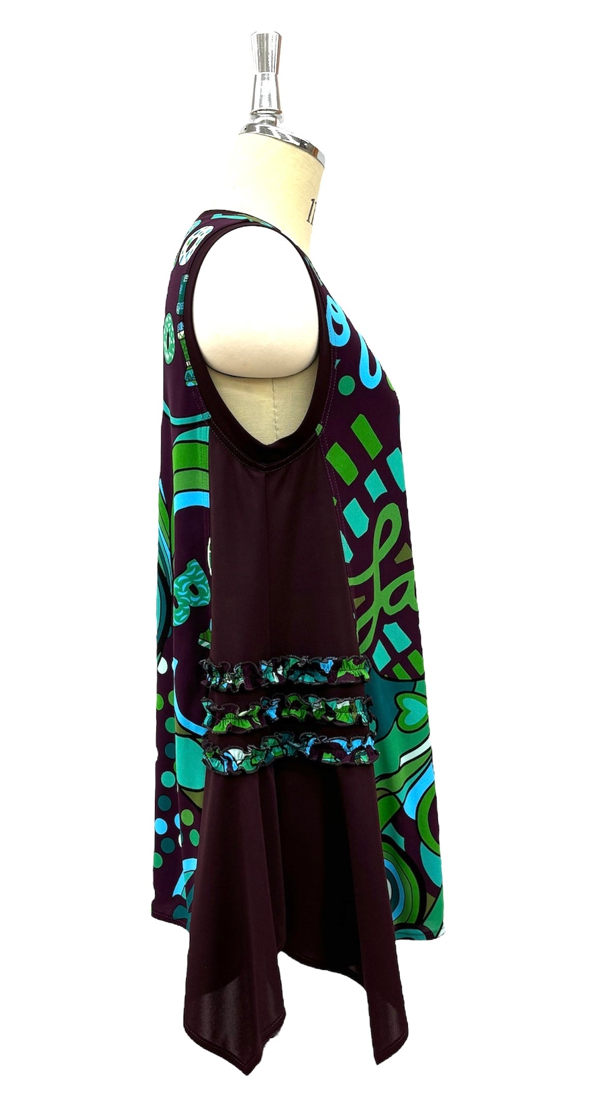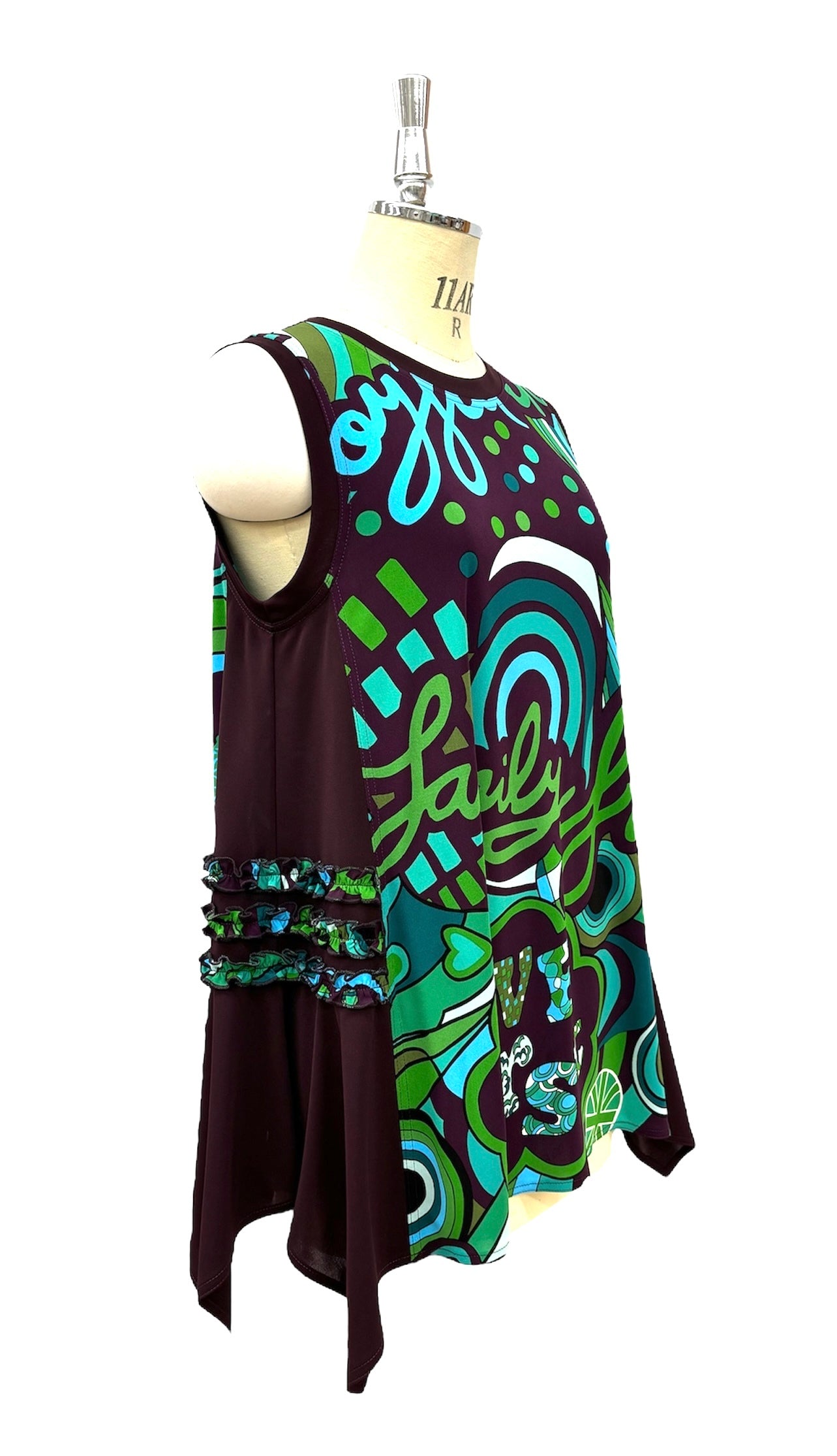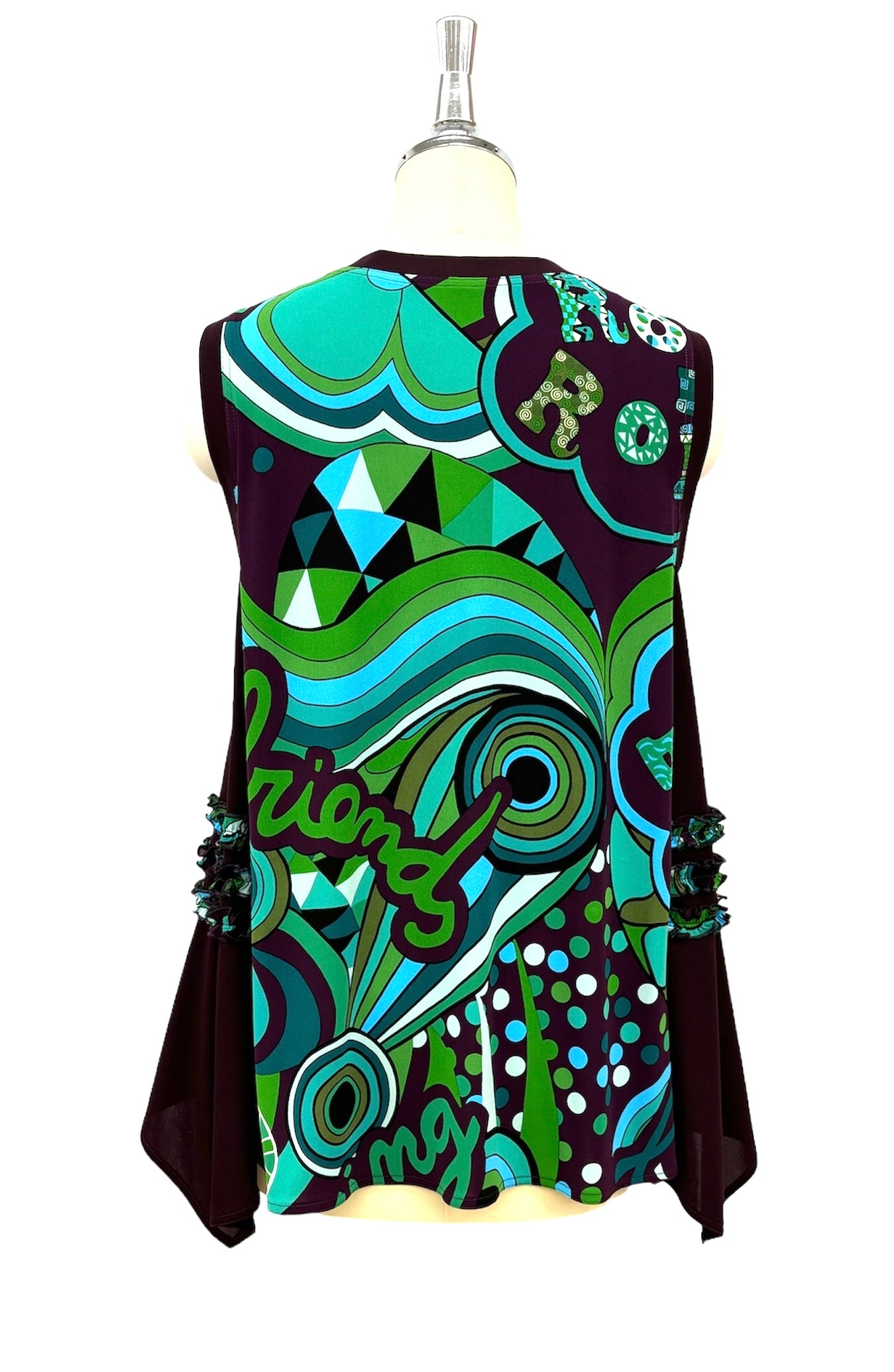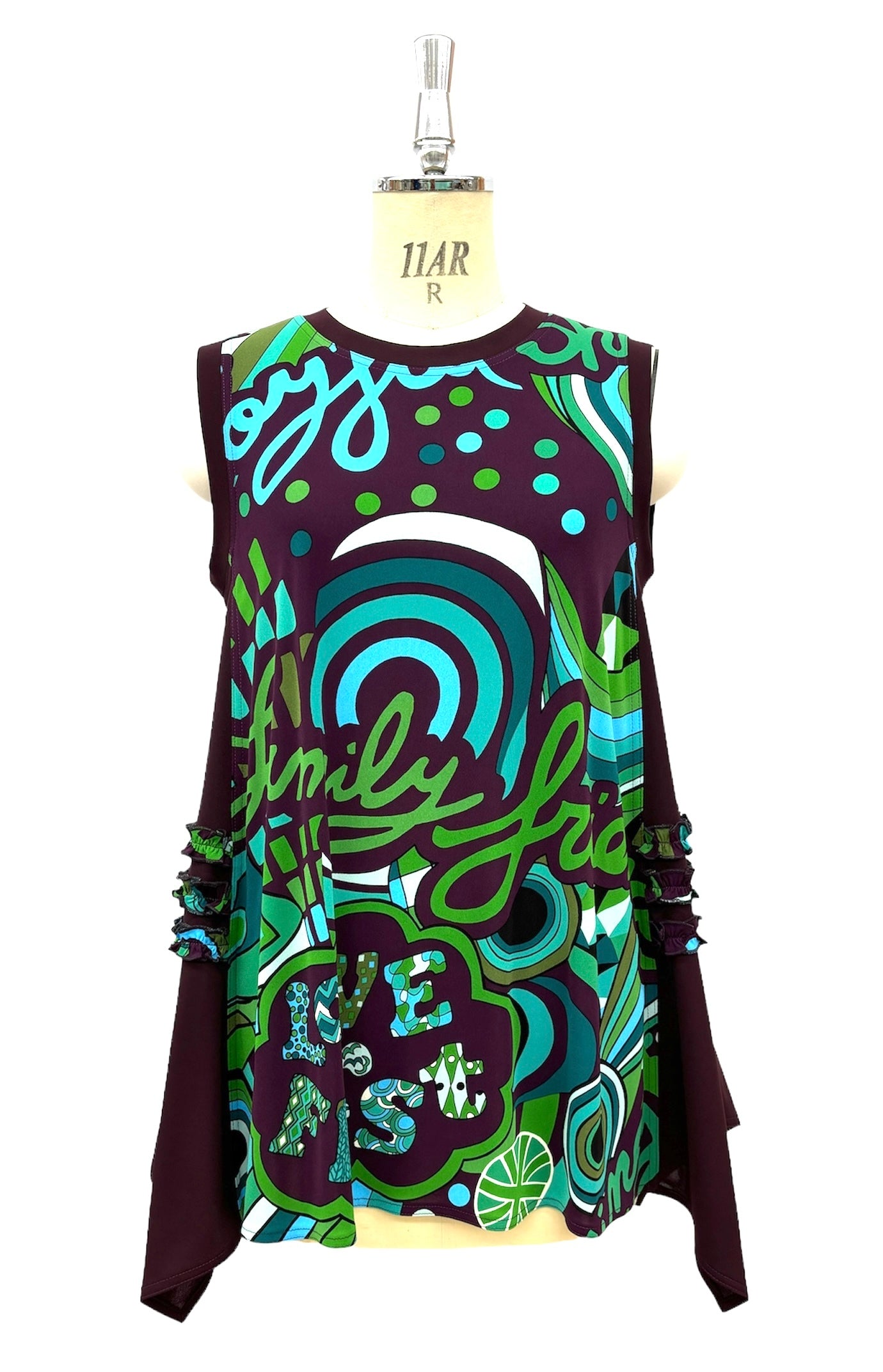 TOKUKOオリジナルのポップアート柄をシンプルな丈が長めのジレに仕上げました。飽きのこないプレーンな形ですがアクセントに脇無地部分に柄でフリルをつけて可愛く仕立ててあります。