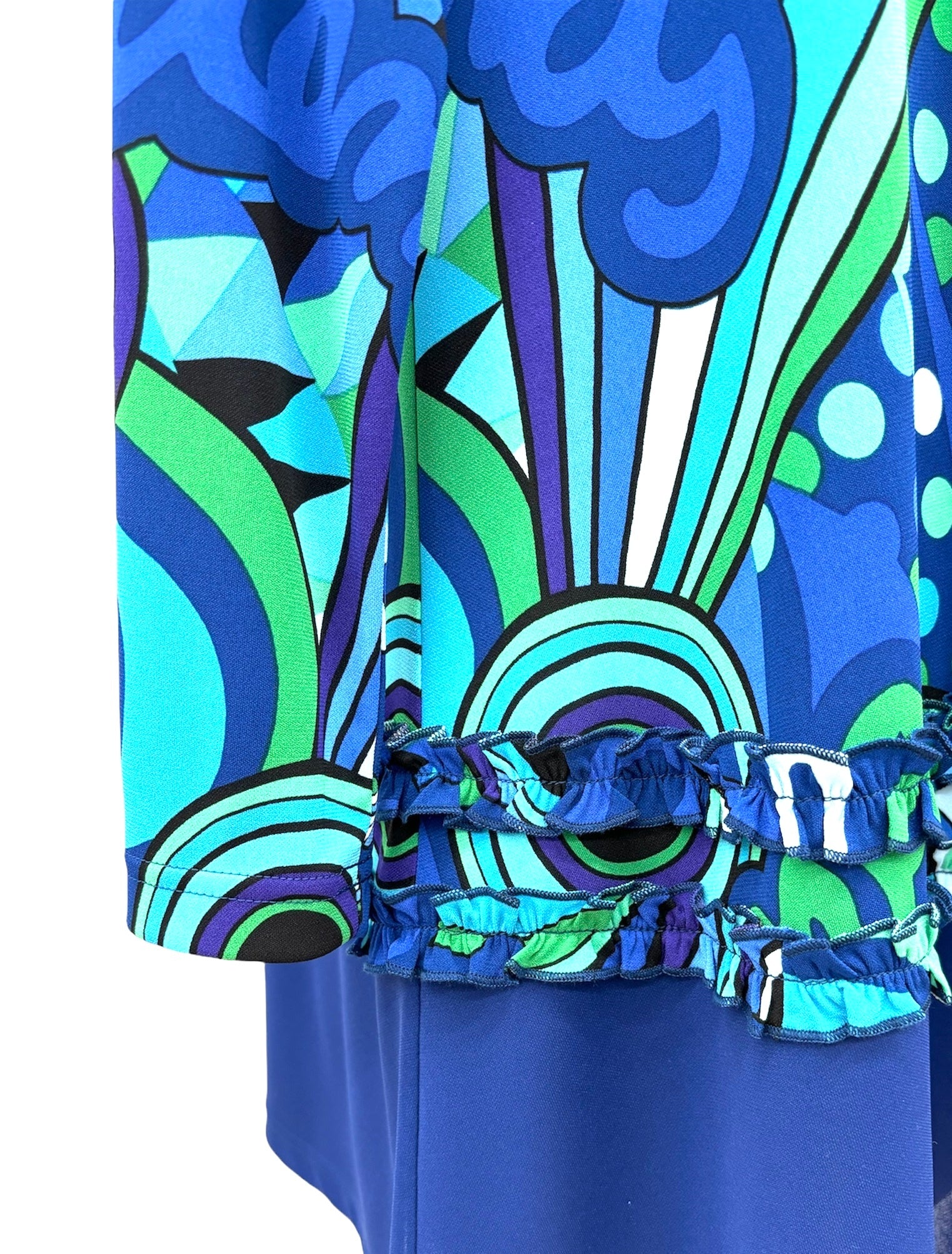TOKUKOオリジナルのポップアート柄をシンプルな丸首Tシャツに仕上げました。飽きのこないプレーン形ですがアクセントに柄でフリルをつけて目立たない程度に可愛く仕立ててあります。